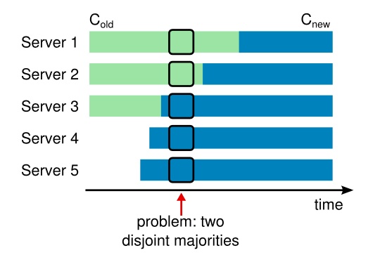 但是存在这样一个问题,服务器的配置从旧到新变更这个过程我们无法保证所有的服务器同时完成,那么就存在这样一个时间点,两个不同的领导人在同一个任期里都可以被选举成功。一个是通过旧的配置,一个通过新的配置。 为了保证安全性,配置变更采用两阶段方法。在Raft中,集群先切换到一个过渡的配置,称之为共同一致(joint consensus);一旦共同一致提交了,系统就切换到新的配置上。