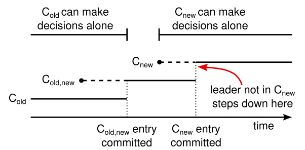 一个配置切换的时间线。虚线表示已经被创建但是还没有被提交的配置日志条目,实线表示最后被提交的配置日志条目。领导人首先创建了 C-old,new 的配置条目在自己的日志中,并提交到 C-old,new 中(C-old 的大多数和 C-new 的大多数)。然后他创建 C-new 条目并提交到 C-new 中的大多数。这样就不存在 C-new 和 C-old 可以同时做出决定的时间点。