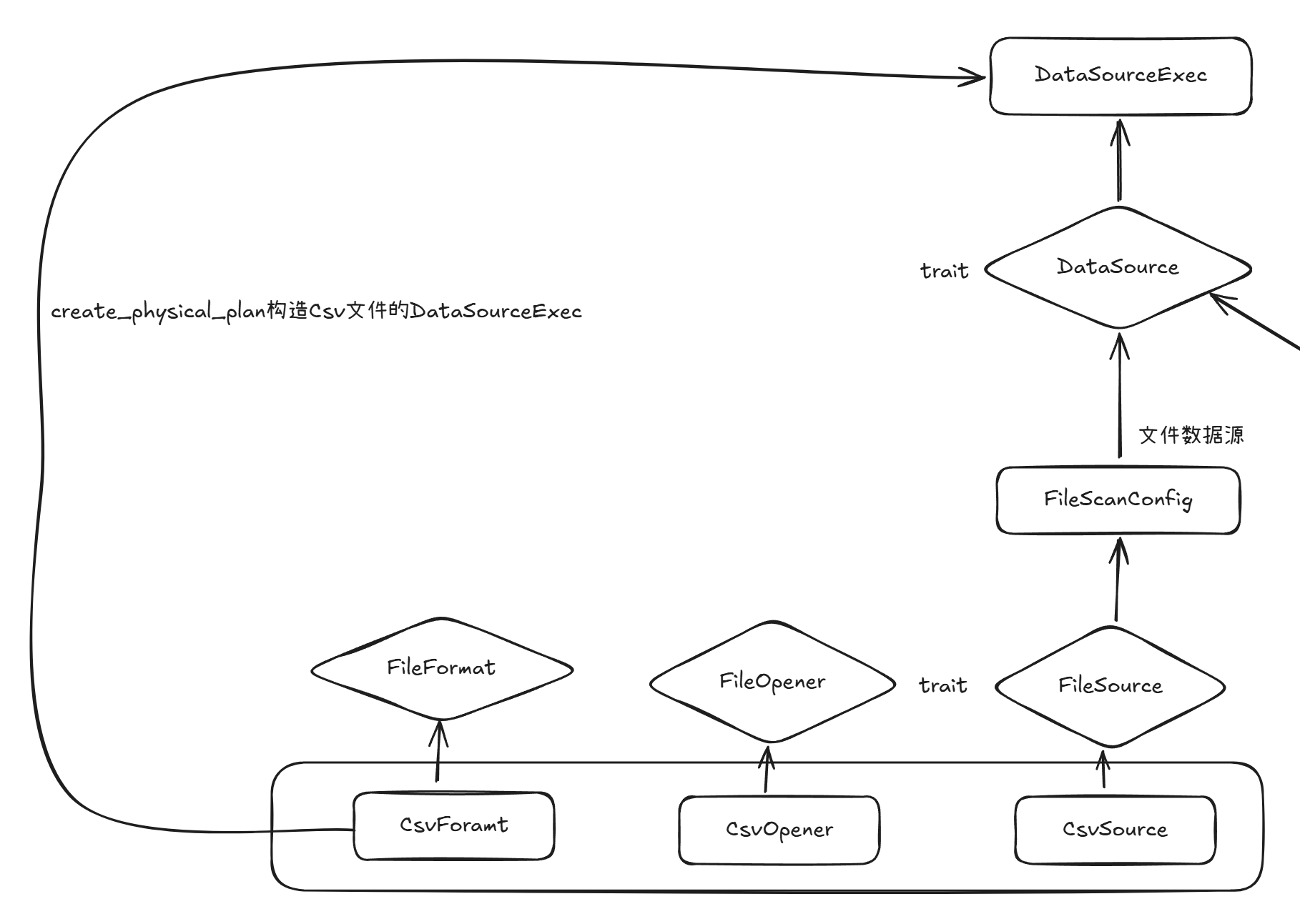 }文件读取的这部分结构,最终都是通过DataSource这个trait来作为执行计划的一部分。从下面的结构其实也是可以看出,正是DataSource这个trait的约束要求上面的File具有对应的能力
