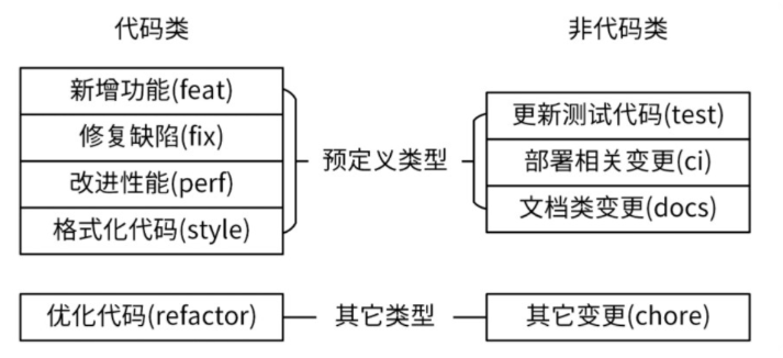 对于type类型,看下图: 对于代码的变更,如果不符合feat、fix、perf、style四种,那么就作为refactor。对于非代码类的变更,如果不符合test、ci、docs,就归于chore。