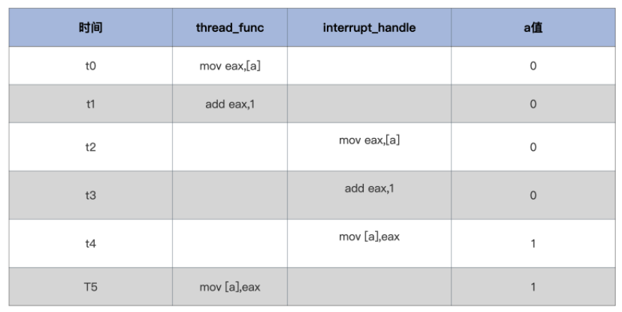 如果出现这样一个情况:thread_func刚执行完第二条指令就发生了中断,CPU执行完中断返回后继续执行第三条指令,最终a的结果为1,这显然是错误的。看下表: