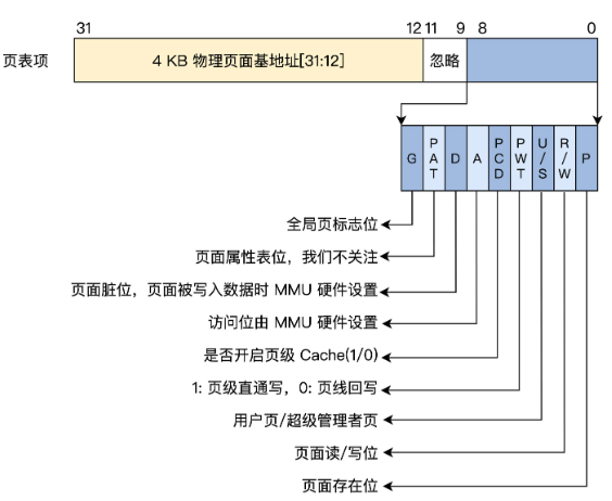 由于页的大小是4KB,所以对应的物理页地址也是4KB对齐的,可以将CR3,页目录项,页表项的低12位都为0,但是实际上,我们可以利用这低12位,存放一些额外信息,如是否可写、可读等等,以便节省空间。