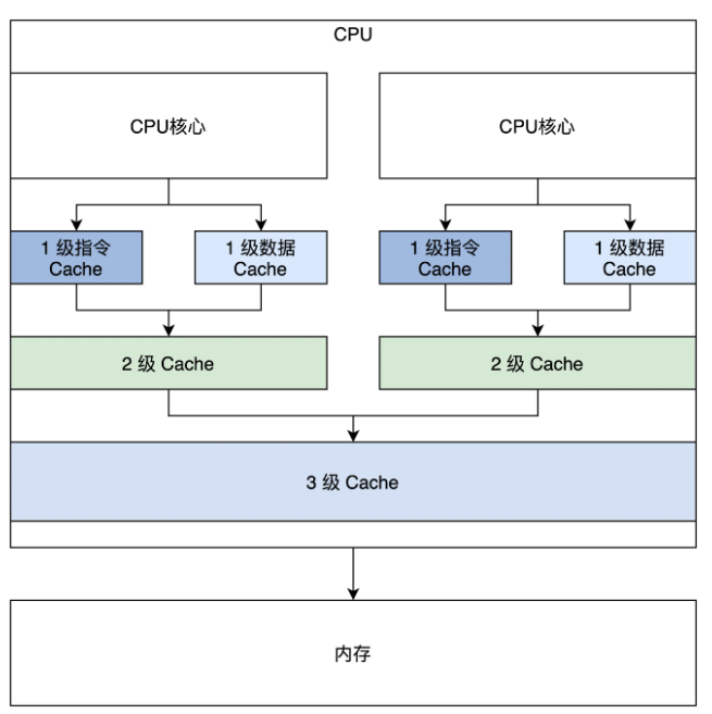 如上图,可以看出来Cache分为三级。一级Cache分为指令Cache和数据Cache,二级Cache是CPU核所私有的,三级Cache是所有CPU核共享的。
