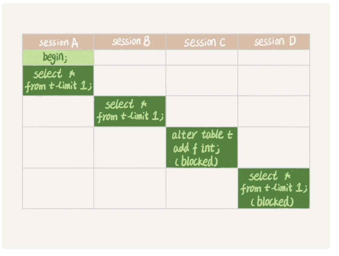- 注意,MDL写锁的优先级是要高于读锁的,SessionC阻塞在获取写锁的步骤中,后续的获取锁的Session也全部都会被阻塞。如果这个表上的查询语句频繁,并且客户端有重试机制(超时再起一个session),那么数据库的线程就很快爆满。