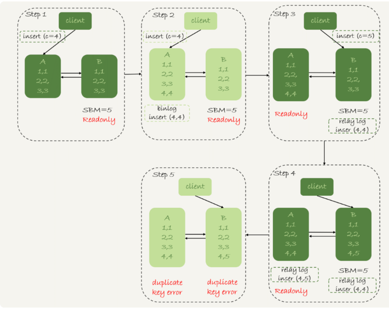可以看到从第二步开始,直到第五步结束,这一段时间里系统是处理不可写状态的。所以需要第一步判断,让seconds_behind_master的值很小,让这个不可用状态的持续时间很短。