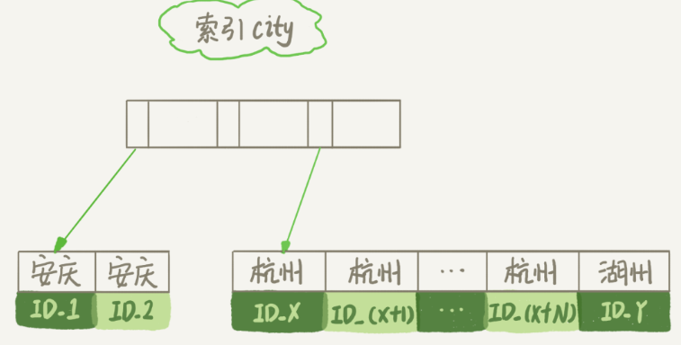 - 从索引city找到第一个满足city=‘杭州’条件的主键id,也就是图中的ID_X。