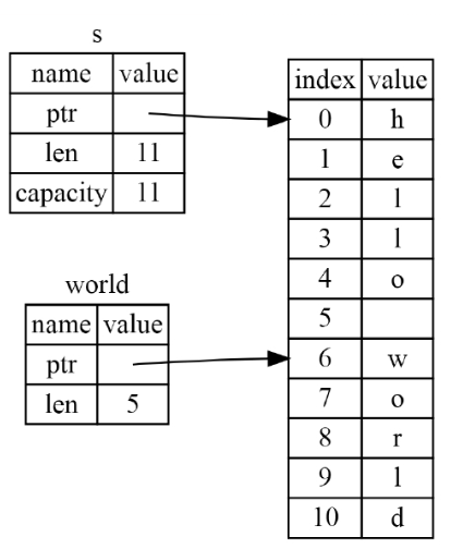 let world = &s[6..11];这里创建了一个切片引用,使用方括号指定切片的范围空间[start_index..end_index],其中start_index表示起始位置的索引,如果省略表示从索引0开始;end_index表示结束位置的下一个索引,如果省略表示包括最后一个字节。