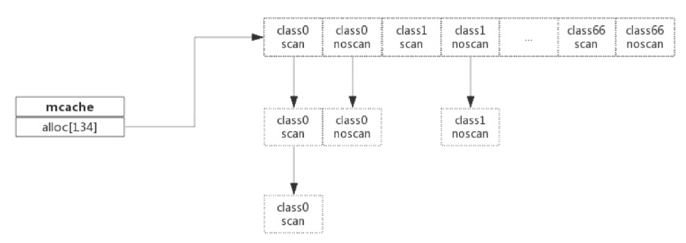 }alloc为mspan的指针数组,数组大小为class总数的2倍。数组中每个元素代表了一种类型的span列表,每种class类型都有两组span列表,第一组列表中所表示的对象中包含了指针,第二组列表中所表示的对象不含有指针,这样可以提高GC扫描性能,对于不包含指针的span列表,没有必要取扫描。