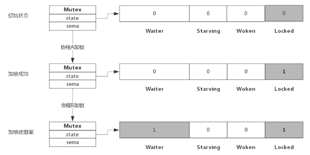 如果加锁的时候,锁已经被其他协程占用了。此时Locked域值为1,对被占用的锁再次加锁时,将Waiter计数器加1,并且阻塞等待Locked值变为0后被唤醒。