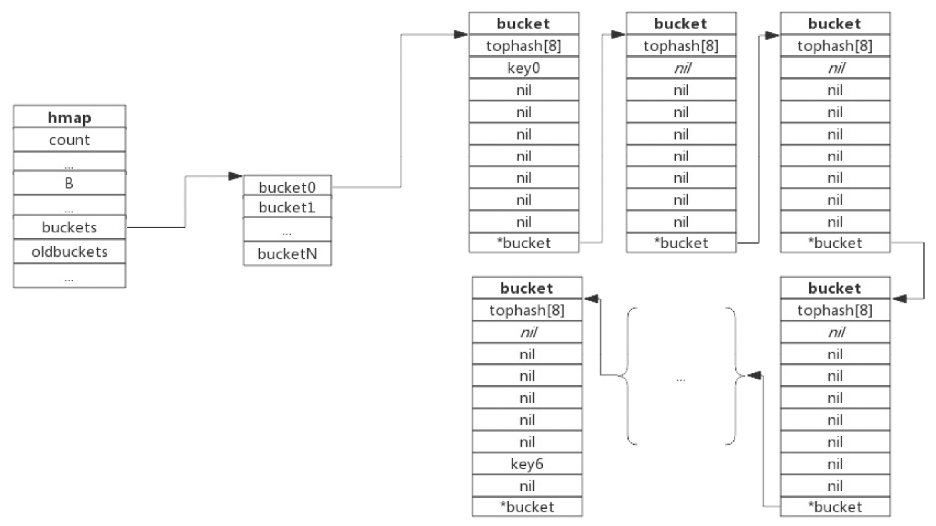 从图中可以看到,bucket中键值对是以先存储键,再存储值的方式进行存储的,这样可以节省字节对齐带来的空间浪费。