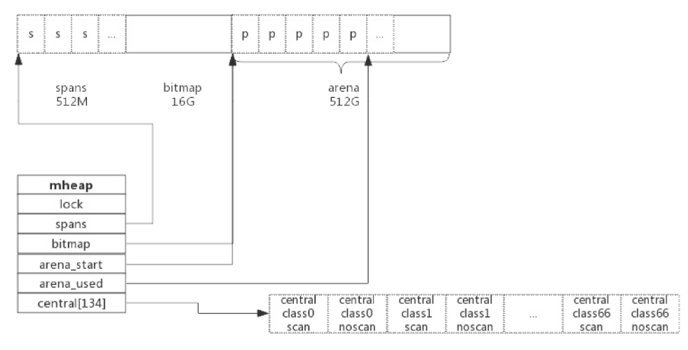 预申请的内存划分为spans、bitmap、arena三部分。其中arena即为所谓的堆区,应用中需要的内存从这里分配。spans和bitmap是为了管理arena区而存在的。