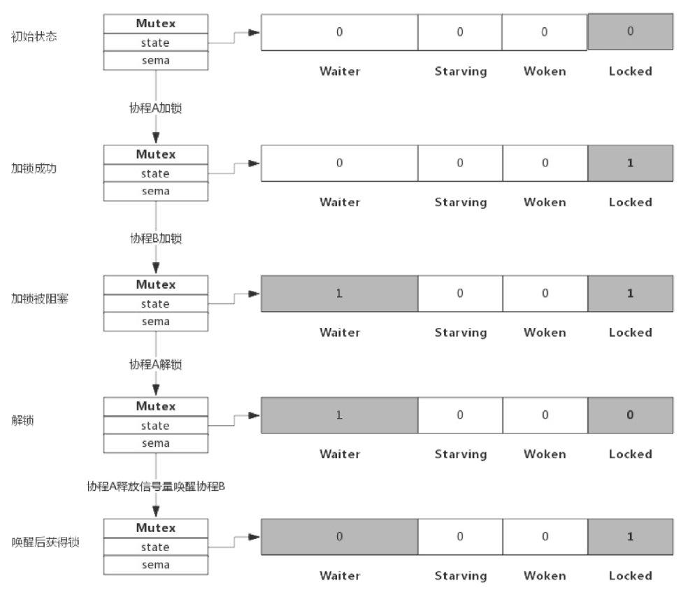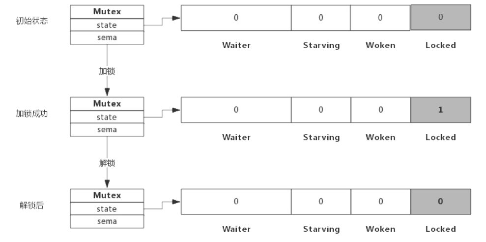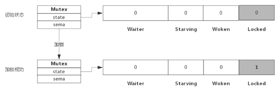 如果加锁的时候,锁已经被其他协程占用了。此时Locked域值为1,对被占用的锁再次加锁时,将Waiter计数器加1,并且阻塞等待Locked值变为0后被唤醒。