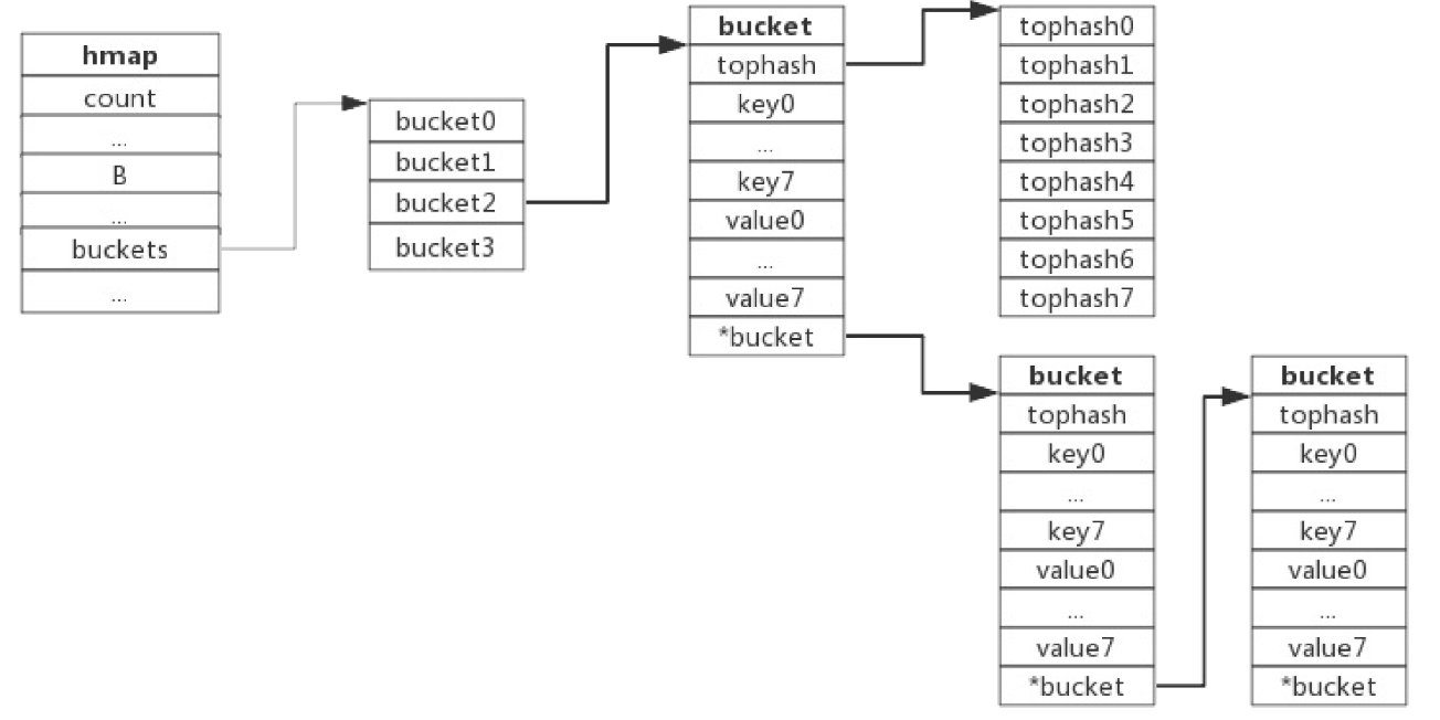从图中可以看到,bucket中键值对是以先存储键,再存储值的方式进行存储的,这样可以节省字节对齐带来的空间浪费。