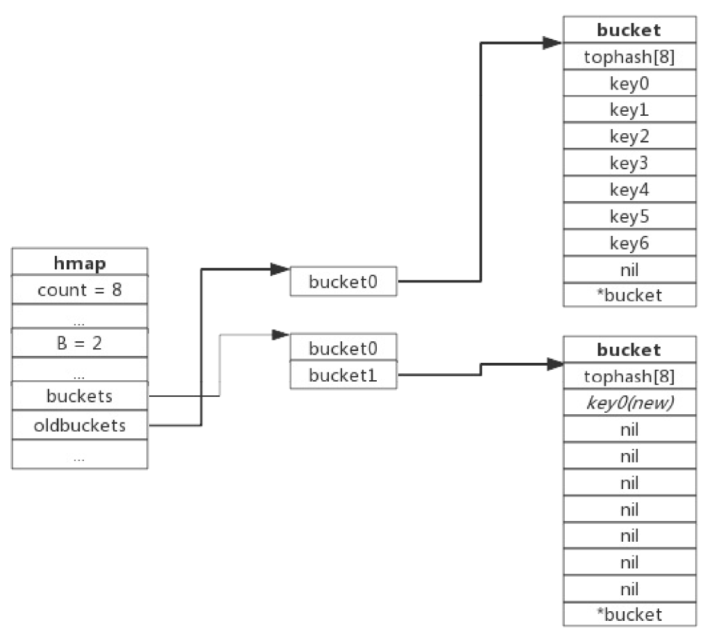 扩容的时候会让buckets指向新申请的更大的bucket,而让oldbuckets指向旧的buckets,搬移结束后oldbuckets删除。