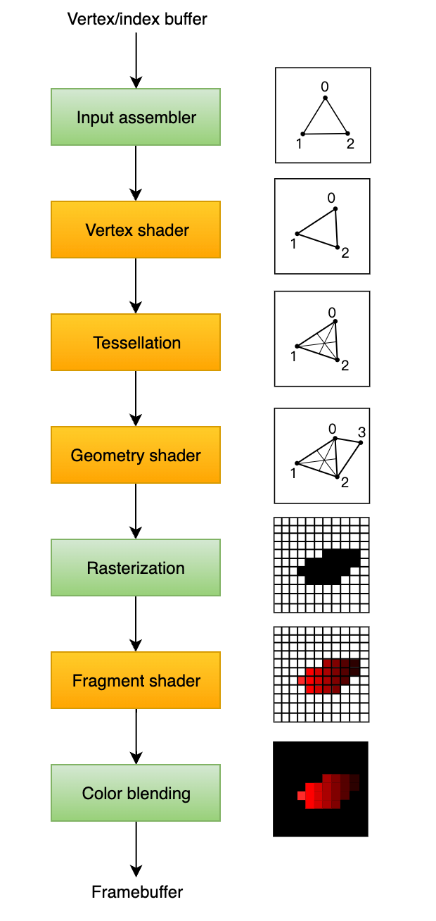 - color blending:用来混合映射到同一个像素的不同片段。 这些阶段在上图中,绿色的部分表示工作流程是预定义的,只能调节一些参数。而橙色的部分则是可以用户自己编写代码实现的。