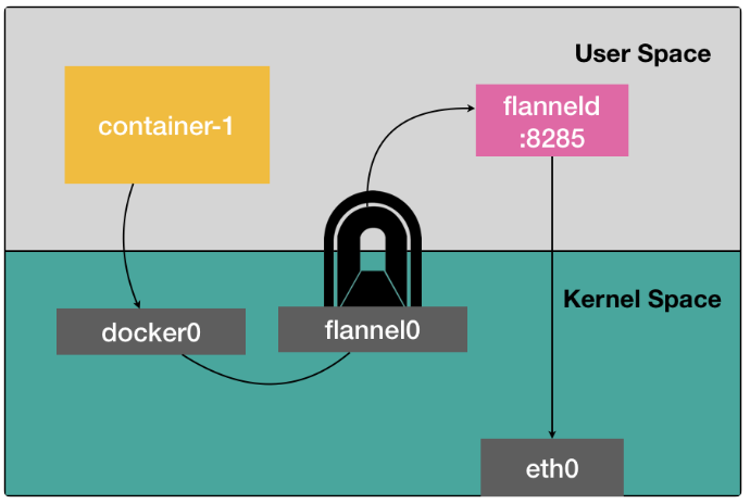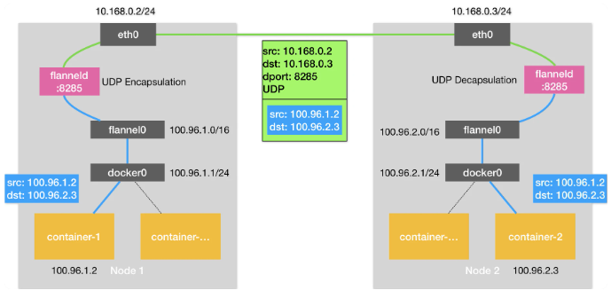 {"PublicIP":"10.168.0.3"}这个过程有点像隧道技术,就是flannel收到conainter-1发送给container-2的IP包之后,目的IP地址解析出container-2所在主机的IP地址,然后将整个IP数据包封装到一个UDP包里。这个UDP包的源IP是Node1的IP,目的IP是Node2的IP。而两台机器上都运行着flannel进程,接受到这个UDP包之后拆开获得两个容器的IP地址。接下来flannel进程只需要把这个IP包发送给它所管理的TUN设备即flannel0设备即可。