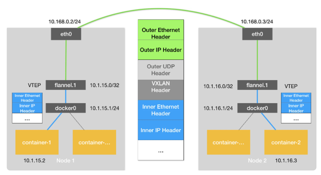 5e:f8:4f:00:e3:37 dev flannel.1 dst 10.168.0.3 self permanent简述一下这个过程。每当由节点加入flannel网络,就会在其它节点加入到此VTEP的路由规则和MAC。然后Node1中的容器于Node2中的容器通信的时候,就会发送到VTEP设备。 这是作为一个二层设备网桥使用的,于是加上目的VTEP设备的MAC地址形成内部数据帧。这个帧需要封装成UDP包,为了标识内部数据帧是VXLAN要使用的数据帧,就需要在封装成UDP包前加上一个VXLAN头。