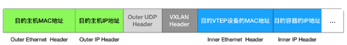 但是这个封装VTEP设备MAC地址的的数据帧对于宿主机来说并没有意义,把它叫做内部数据帧,宿主机之间想要通过是需要通过宿主机的eth0网卡的信息进行传输的。因此需要封装成宿主机可用的外部数据帧,这个数据帧内部装载着内部数据帧。