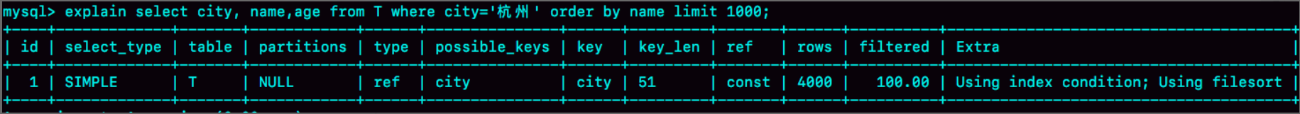 可以看到选择了city索引,不过我们需要关注的是Extra这个字段中的”Using filesort”,表示需要进行排序,MySQL会给每个线程分配一块内存用于排序,称为sort_buffer。
