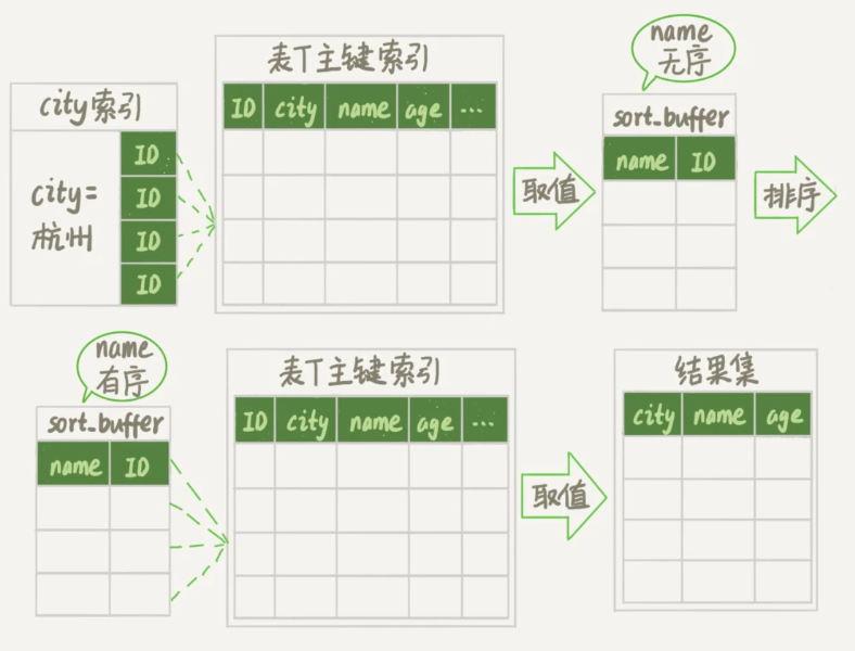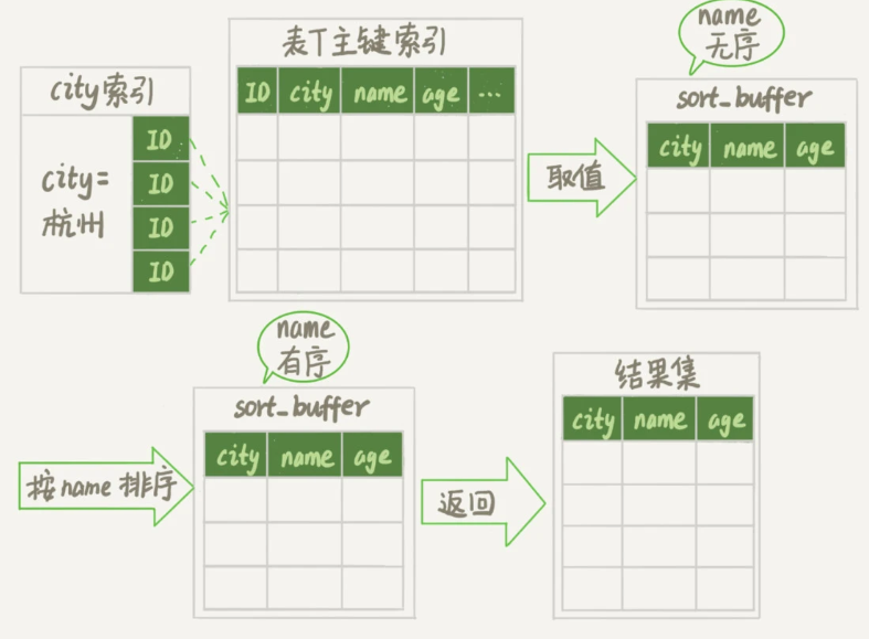 - 到主键id索引取出整行,取name, city, age三个字段的值,存入sort_buffer中;